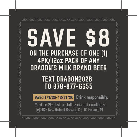 $8.00 cash back with purchase of (1) Dragon's Milk 4pk/12oz bottles.