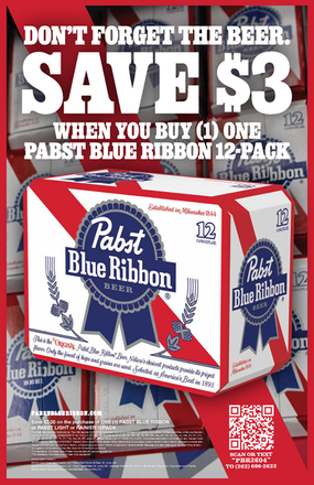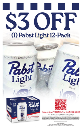 $3.00 cash back with purchase of (1) Pabst Light or Pabst 12 Pack.