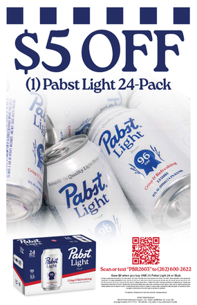 $5.00 cash back with purchase of (1) Pabst Light or Pabst 24 pack.