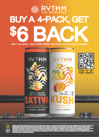 Buy a 4-Pack of a Rythm THC beverage and get $6.00 cash back via rebate. Limit of 2 rebates per person. Valid 4/15/2026-7/15/2026. Must be 21+ years of age and must show proof of purchase to claim rebate offer